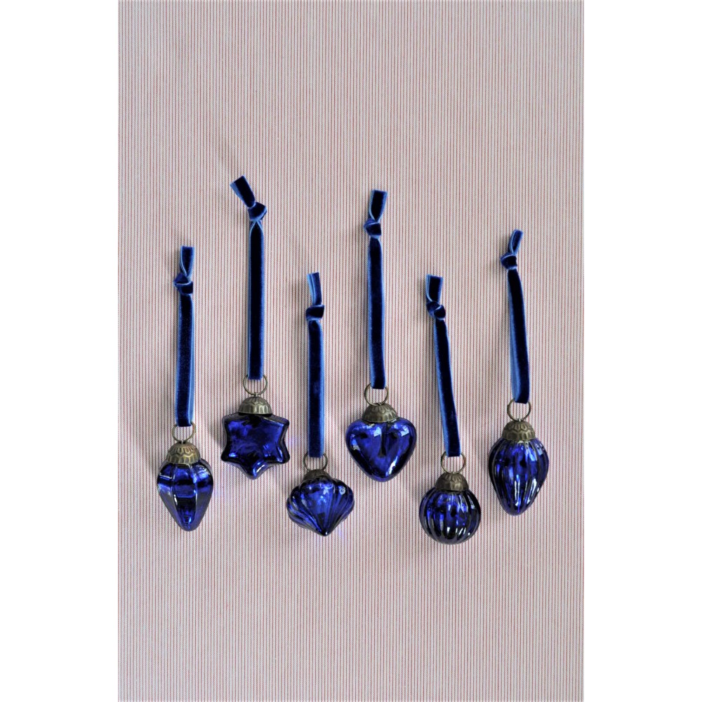 Είναι γυάλινες, δεμένες με βελούδινη κορδέλα και το μέγεθός τους είναι περίπου 4 εκ.